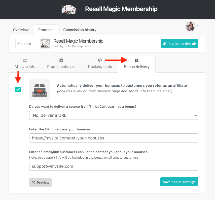 • Enable Bonus Delivery: Navigate to the "Bonus Delivery" tab and enable "Automatically deliver your bonuses to customers you refer as an affiliate."